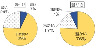 温度については「温かい」と回答する患者さんが76%見られ、多くの患者さんに温かく食事を提供できていることが分かりました。しかし、17%の患者さんは「冷たい」と回答しているため、より温かく配膳できるように工夫していきます。