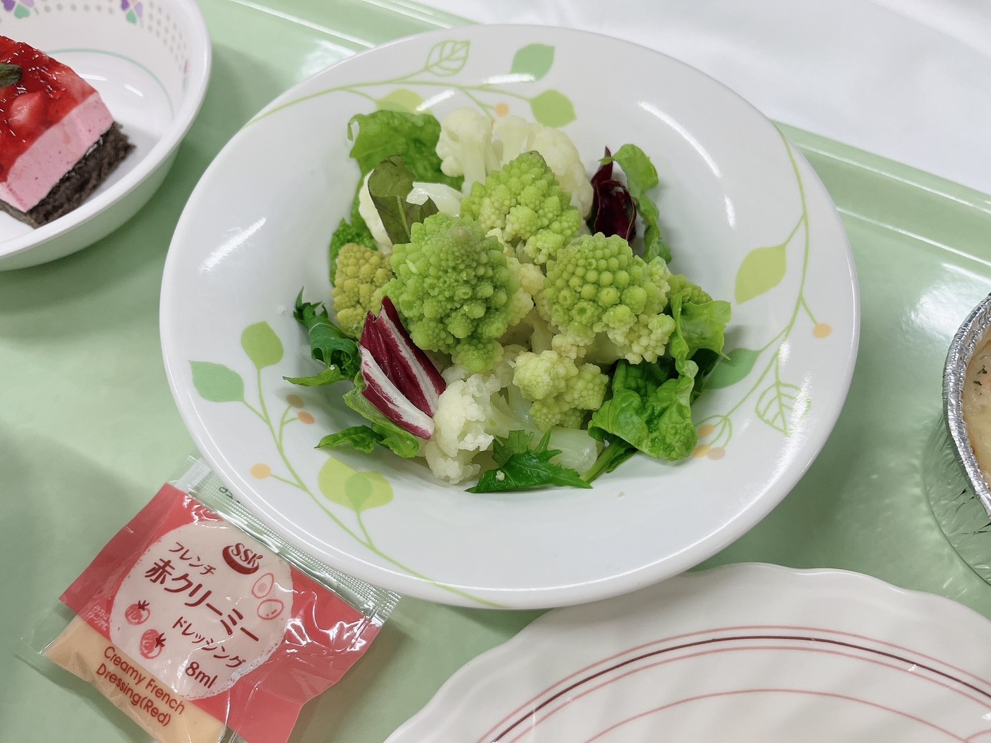 以前から、ロマネスコって房に分けると「クリスマスツリー」のようにも見えるなあ…と思いながら食べていたので、今年のクリスマスマスメニューはロマネスコを使用した、「ロマネスコのツリーサラダ」を献立に取り入れ、ツリーをイメージして盛り付けました。