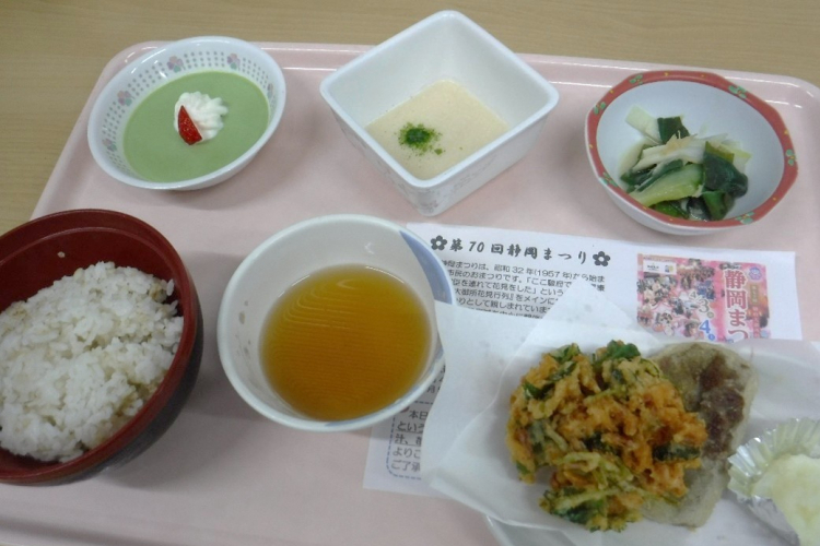 4月3日の夕食は、静岡まつりに合わせ、静岡の特産を盛り込んだ静岡まつり御膳を提供しました。 患者さんへの食事の準備の前に、先輩調理師から若手スタッフへ、「桜エビのかき揚げ」のコツを伝授しました。桜エビのかき揚げは年に数回しか献立に入らないため若手スタッフが調理担当となる確率が少ない献立の一つです。 先輩から「ポイントは、冷水を使用し衣は混ぜすぎないこと、揚げている途中、菜箸