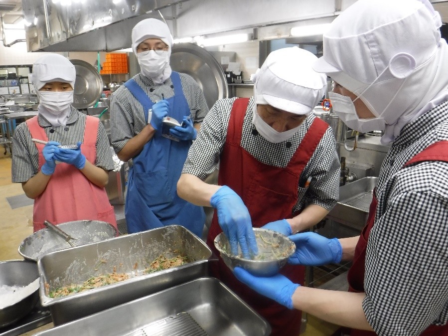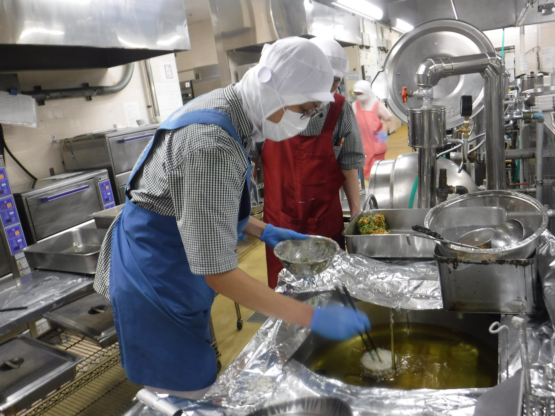 患者さんへの食事の準備の前に、先輩調理師から若手スタッフへ、「桜エビのかき揚げ」のコツを伝授しました。桜エビのかき揚げは年に数回しか献立に入らないため若手スタッフが調理担当となる確率が少ない献立の一つです。